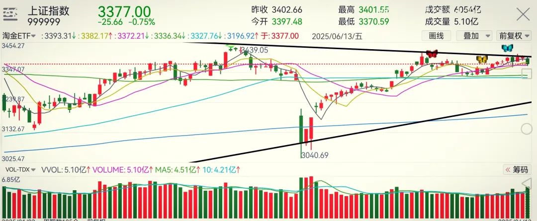 从技术分析的角度来看,前一天就曾预判,若当日低开,大盘将对3350 - 3360这一关键支撑区间发起测试。然而,6月13日市场的实际走势却略显“倔强”,最低仅触及3370.59点,未能真正进入该关键区域。这一情况为后续走势增添了更多不确定性,也使得下周一的行情变得愈发关键。